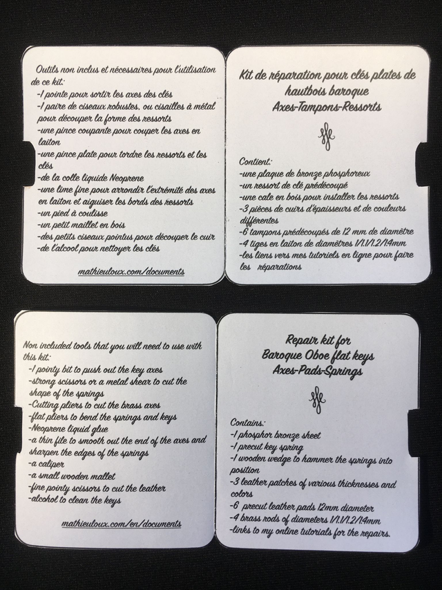 This baroque oboe repair kit contains a selection of hard-to-find material, that will spare you the hassle of an expensive trip or shipment to your oboe maker. It will allow you to change the pads of your flat keys, and to replace a spring or a missing/damaged key axis, with the addition of a few simple tools not included in this kit.